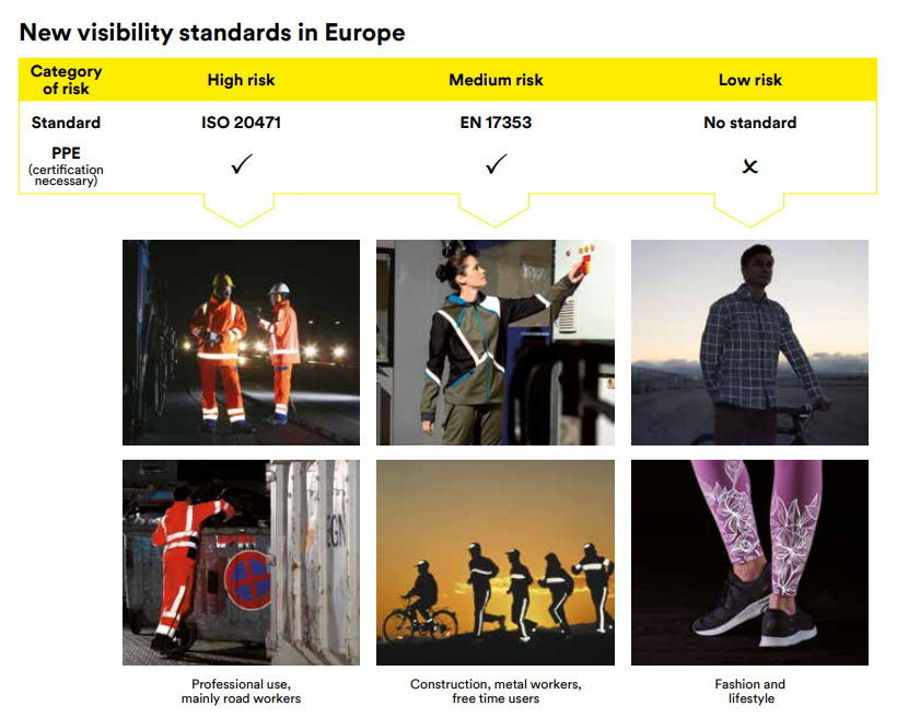 - High visibility equipment in high-risk situations, which is covered in EN ISO 20471 (for further information concerning risk situations, please contact us);
