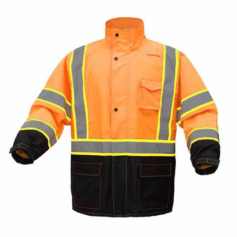 Our Hi Vis Safety Rain Jacket, part of heavy-duty waterproof hi-vis workwear, is crafted with 100% waterproof PU coating and fully taped seams. It’s designed for demanding environments with unique features like glove-friendly zippers and extra pullers for easy access. Adjustable cuffs, longer backs, and multi-pockets enhance waterproofing and utility. Experience the quality and functionality that sets our Hi Vis Safety Rain Jacket apart from standard waterproof workwear.